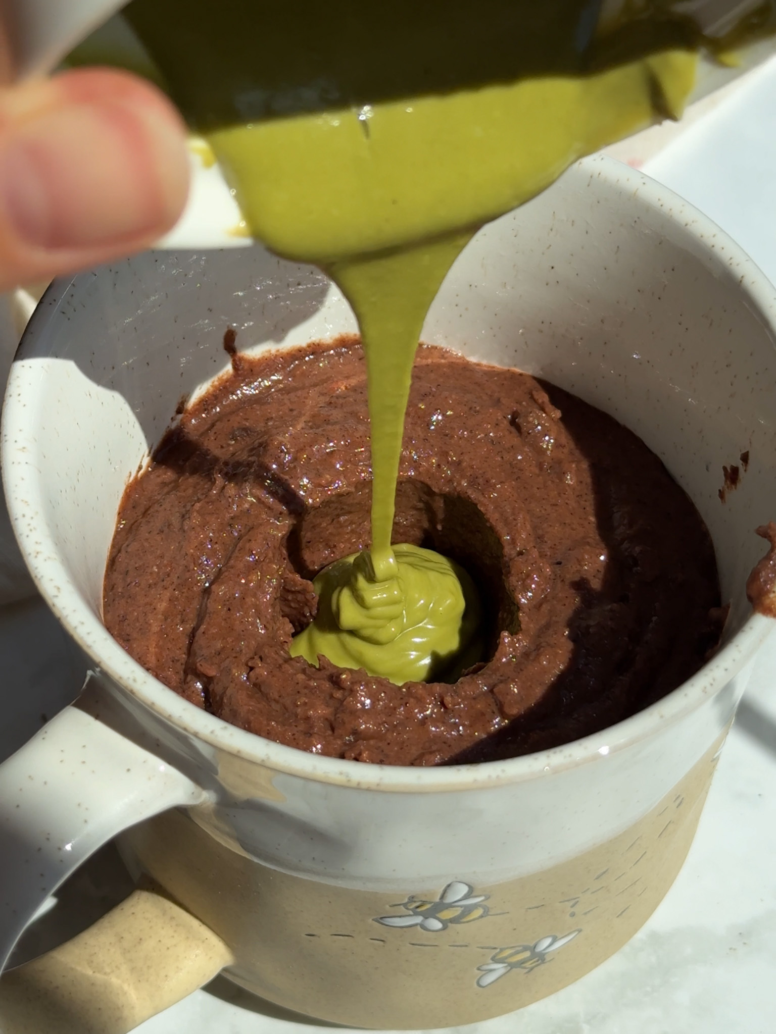 - Transfer half of the batter to a mug, add the pistachio filling, then add the rest of the batter.